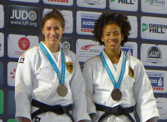 Miryam Roper vom TSV Bayer 04 Leverkusen (Foto rechts), die krankheitsbedingt beim Heim-Grand-Prix in Düsseldorf nicht an den Start gehen konnte, meldete sich mit zwei souveränen Vorrundensiegen auf der internationalen Bühne zurück. Im Halbfinale musste sich die Deutsche Meisterin gegen Sumiya Dorjsuren aus der Mongolei, die beim Grand-Prix in Düsseldorf einen zweiten Platz belegt hatte, geschlagen geben. Im Kampf um Platz drei gegen Loredana Ohai aus Rumänien, U23-Europameisterin von 2013, ließ die Weltranglistenvierte nichts anbrennen und beendete die Begegnung vorzeitig mit O-uchi-gari.